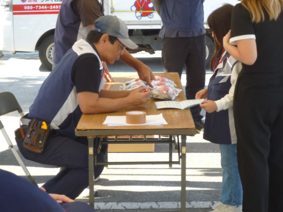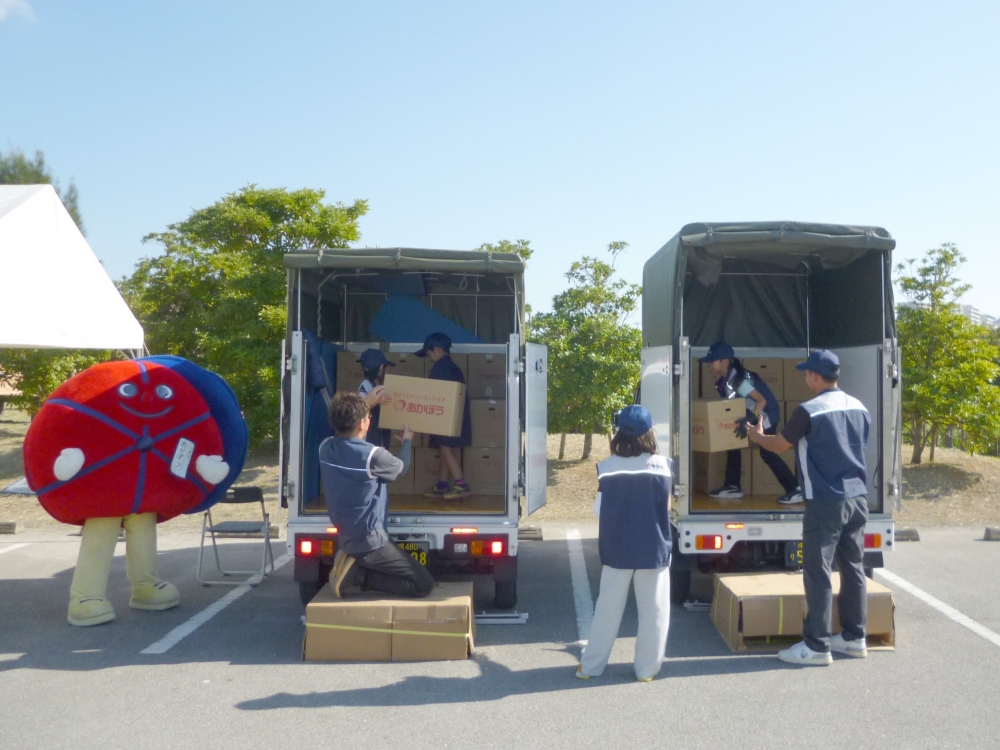 赤帽ブースでは、子供たちに赤帽車へ荷物を載せる作業を体験していただきました。参加賞として「あかぼうオリジナルグッズ」を配布し、さらにキャラクター「あかぼうくん」との記念撮影も行い、来場者に大変喜んでいただきました。